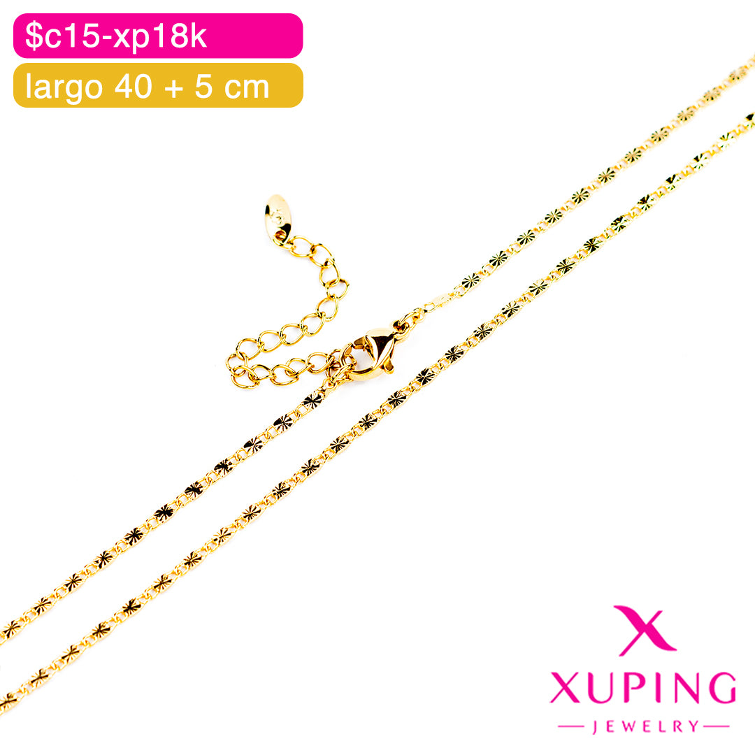 Descubre la elegancia contemporánea con nuestra cadena marca Xuping, confeccionada en aleación de cobre con un acabado enchapado en oro 18K que asegura durabilidad y brillo excepcionales. Su diseño combina sofisticación y tendencia, ideal para complementar cualquier look con un toque moderno y refinado.
