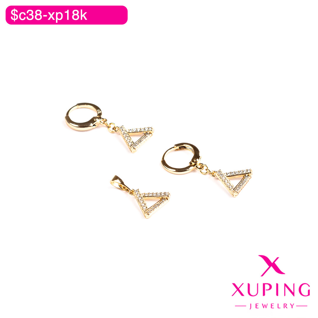 Este juego de triángulo de la marca Xuping destaca por su diseño moderno y elegante, elaborado en aleación de cobre con chapado en oro 18K que garantiza un acabado brillante y duradero. Los aretes cuentan con un broche tipo omega, proporcionando comodidad y seguridad al usarlos. Ideal para quienes buscan un accesorio distintivo que realce cualquier outfit con un toque de sofisticación contemporánea.
