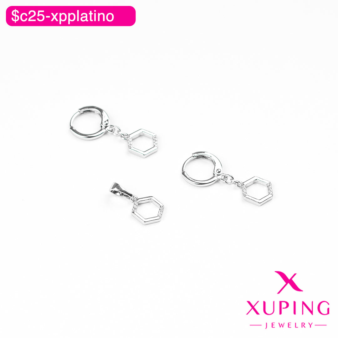 Cautiva miradas con este exclusivo juego de hexágono plateado, elaborado en fina aleación de cobre con lujoso chapado en platino. Sus aretes con broche omega aseguran un ajuste perfecto y cómodo durante todo el día. El diseño geométrico hexagonal aporta un toque contemporáneo y sofisticado que complementa cualquier atuendo. Una pieza versátil que equilibra elegancia moderna y distinción, ideal para quienes buscan destacar con un estilo único y refinado.